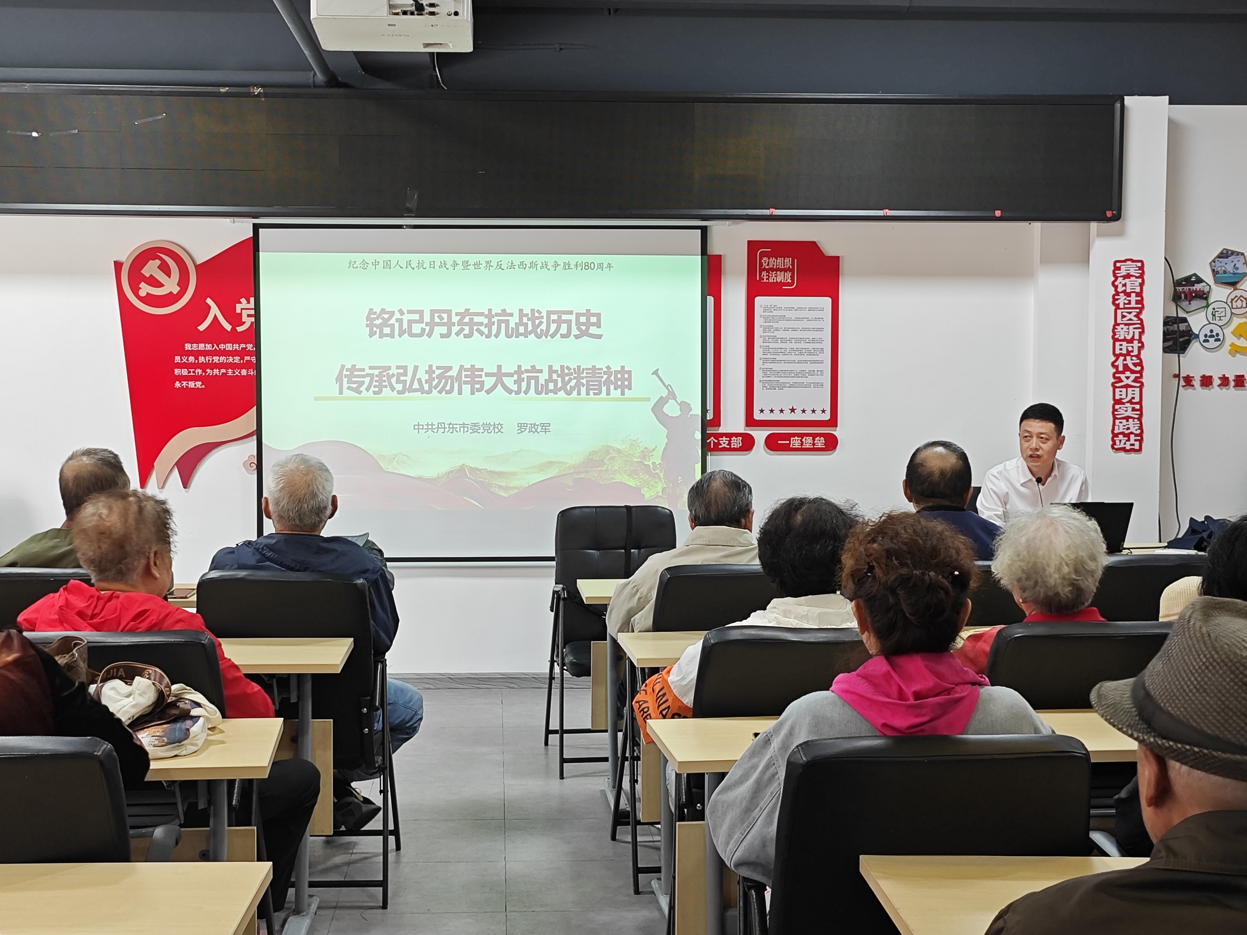 活动中,罗政军老师进行了题为《铭记丹东抗战历史 传承弘扬伟大抗战精神》的主题宣讲,带领大家共同回望丹东抗战历史、深入领会伟大抗战精神的意义、深刻理解伟大抗战精神的内涵。宣讲既有理论高度又贴近实际,史料翔实、故事动人,传递了爱国信仰,弘扬了民族精神,引发现场老党员的强烈共鸣。